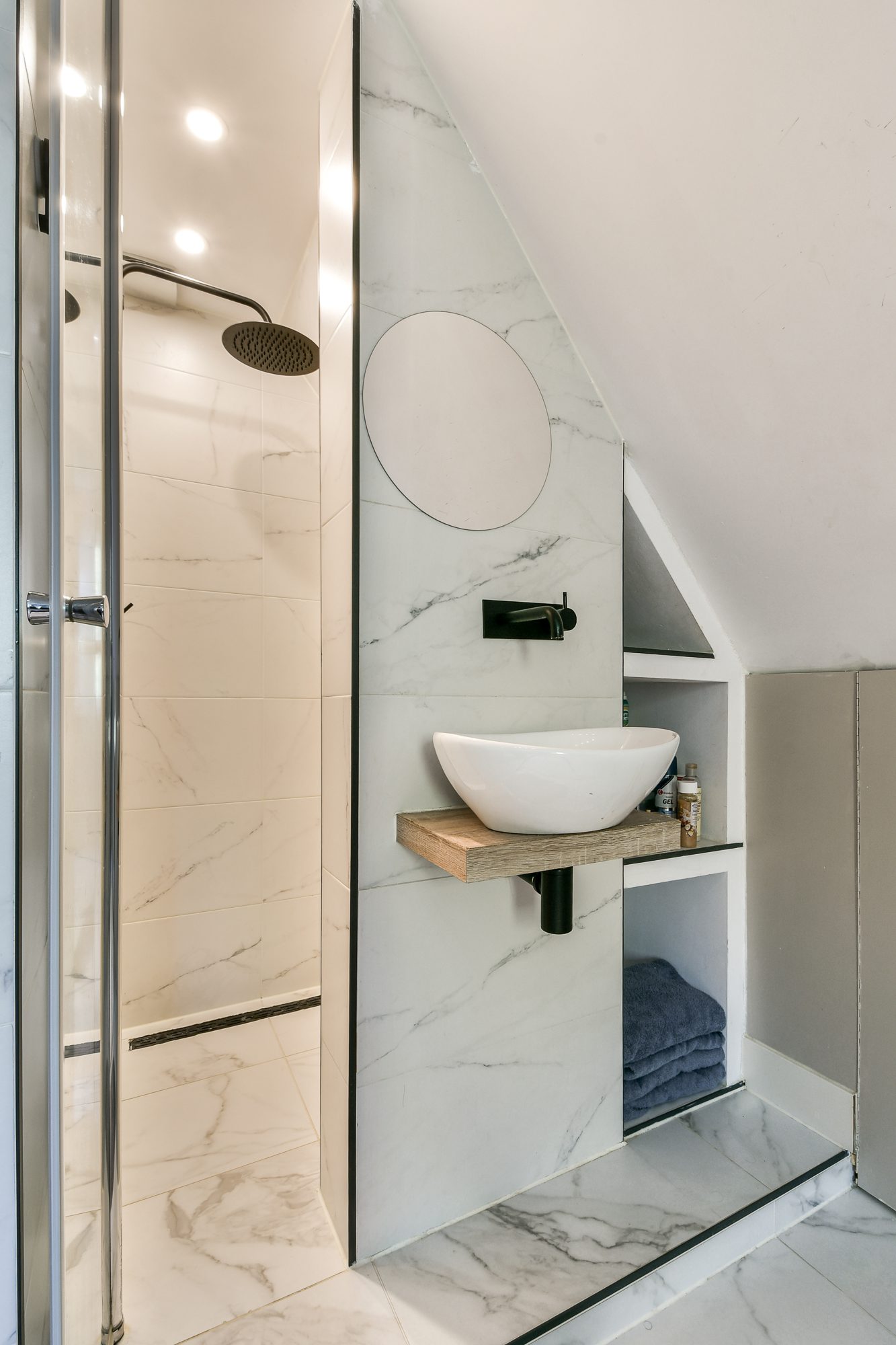 -De master bedroom (ZW) heeft directe toegang tot de badkamer, die volledig is betegeld en voorzien van een ligbad onder het raam, een regendouche met glazen wand, moderne thermostaatkranen, handdoekradiator en een dubbel wastafelmeubel met spiegels.