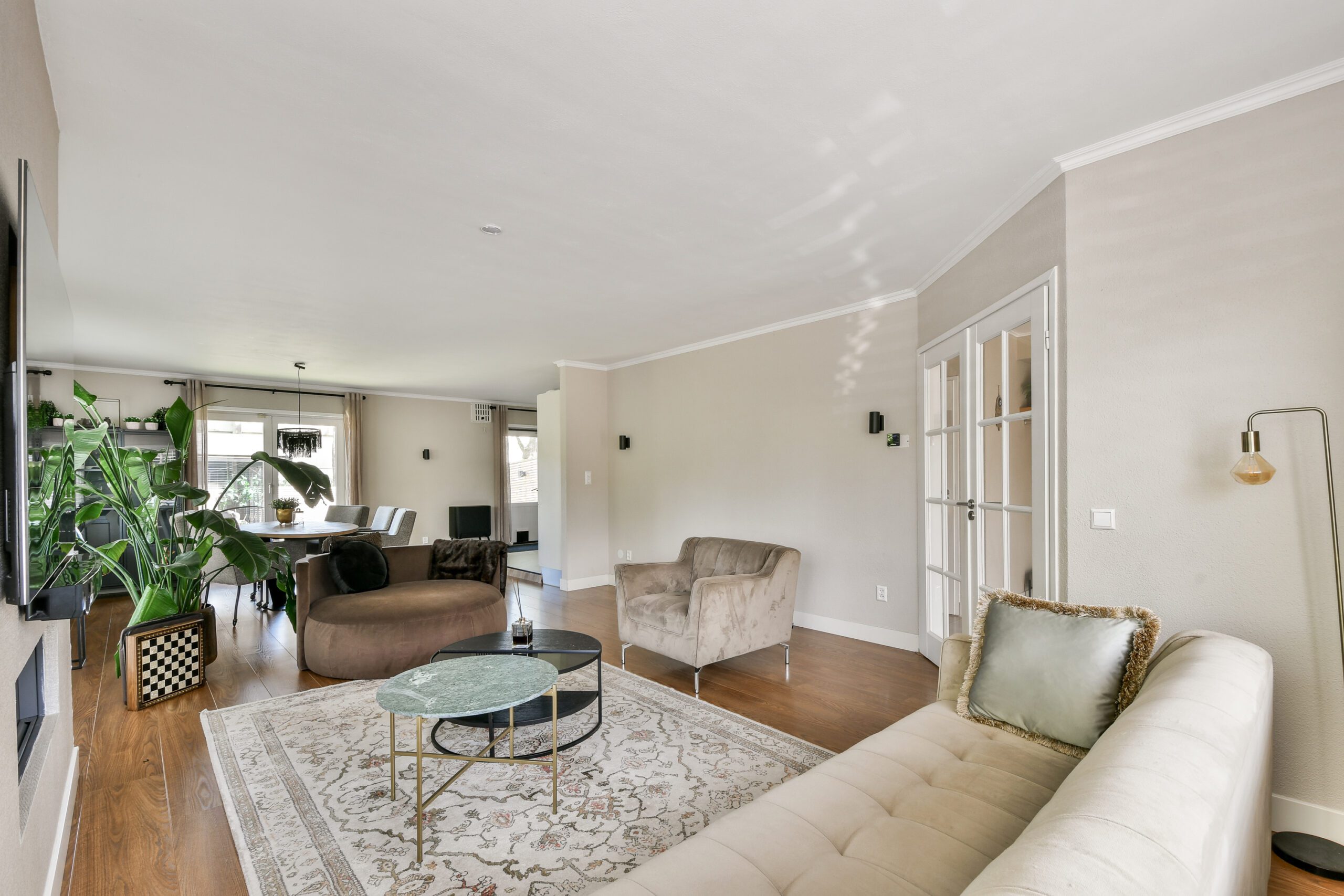 Dubbele deuren geven toegang tot de lichte woonkamer met grote raampartijen. Rond de brede gashaard is een sfeervolle zithoek gecreëerd. Aan de achter- en zijkant zorgen openslaande deuren voor een directe verbinding met de tuin. De open keuken is volledig uitgerust met hoogwaardige apparatuur, waaronder een 6-pits gasfornuis met wokbrander, Siemens combi-oven, koel-/vriescombinatie, vaatwasser en RVS-spoelbak.